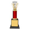 The image shows a trophy with a modern and elegant design. The trophy features three golden stars stacked in an upward diagonal arrangement, symbolizing success, excellence, or achievement. These stars are mounted on a black base that has a golden nameplate area on the front, which is typically used for engraving the recipient’s name or award title. The overall color scheme is black and gold, giving it a luxurious and celebratory appearance.