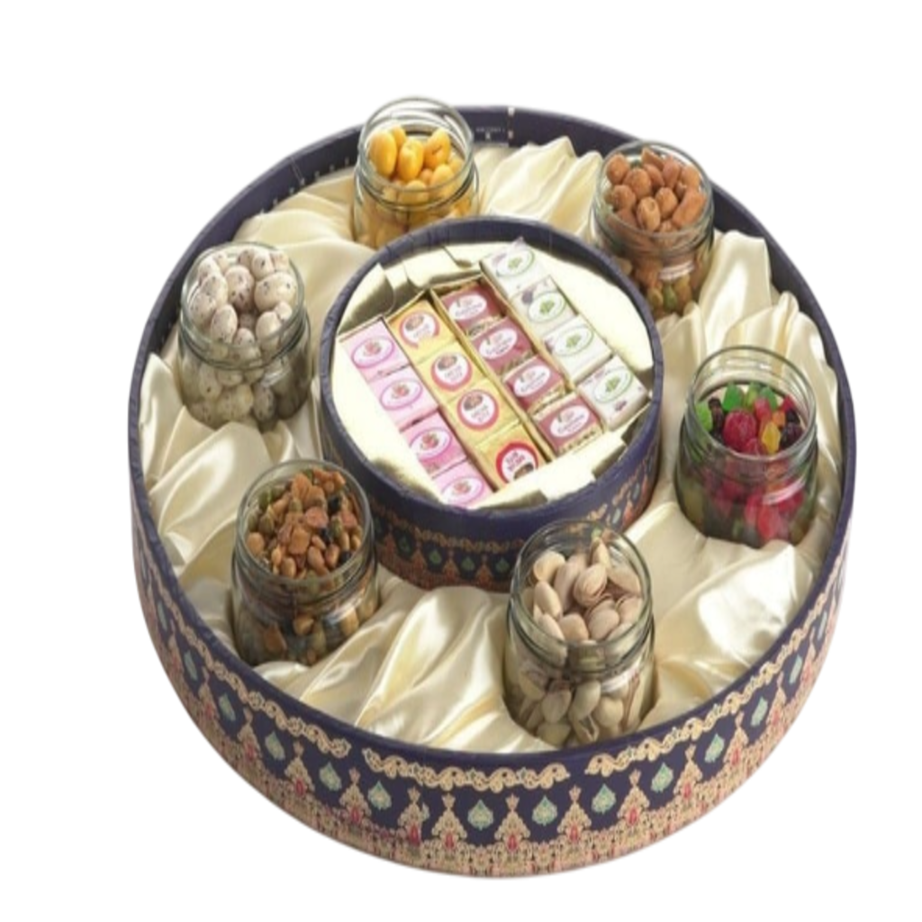 Overall, it looks like a luxury dry fruit and sweet gift box, ideal for festive occasions such as Diwali, Eid, or weddings.