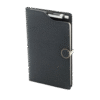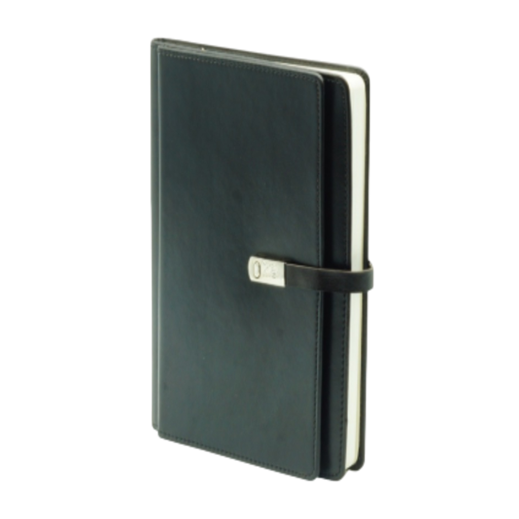 This is a black leather-bound notebook with a sleek and professional appearance. It features a smooth, hard cover and a strap closure that loops around the front and fastens with a metal clasp. The edges are neatly stitched, giving it a refined and durable finish. Inside, the notebook contains white or lightly colored pages, suitable for writing or note-taking. Its compact size and stylish design make it ideal for business, school, journaling, or personal planning.