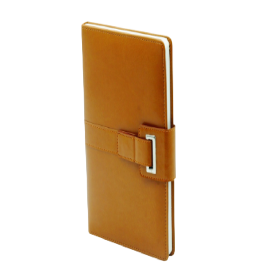 • A leather strap with a metallic buckle clasp secures the notebook, giving it an elegant and formal look.
