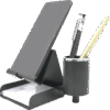 On the left side, there is a smartphone stand holding a phone upright at an angle.