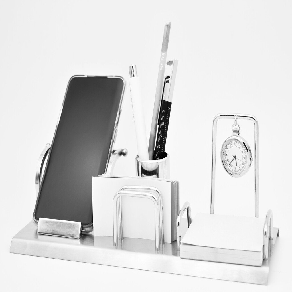 Above the notepad section, a small hanging pocket watch-style clock is suspended from a metal frame, adding a touch of elegance and functionality.