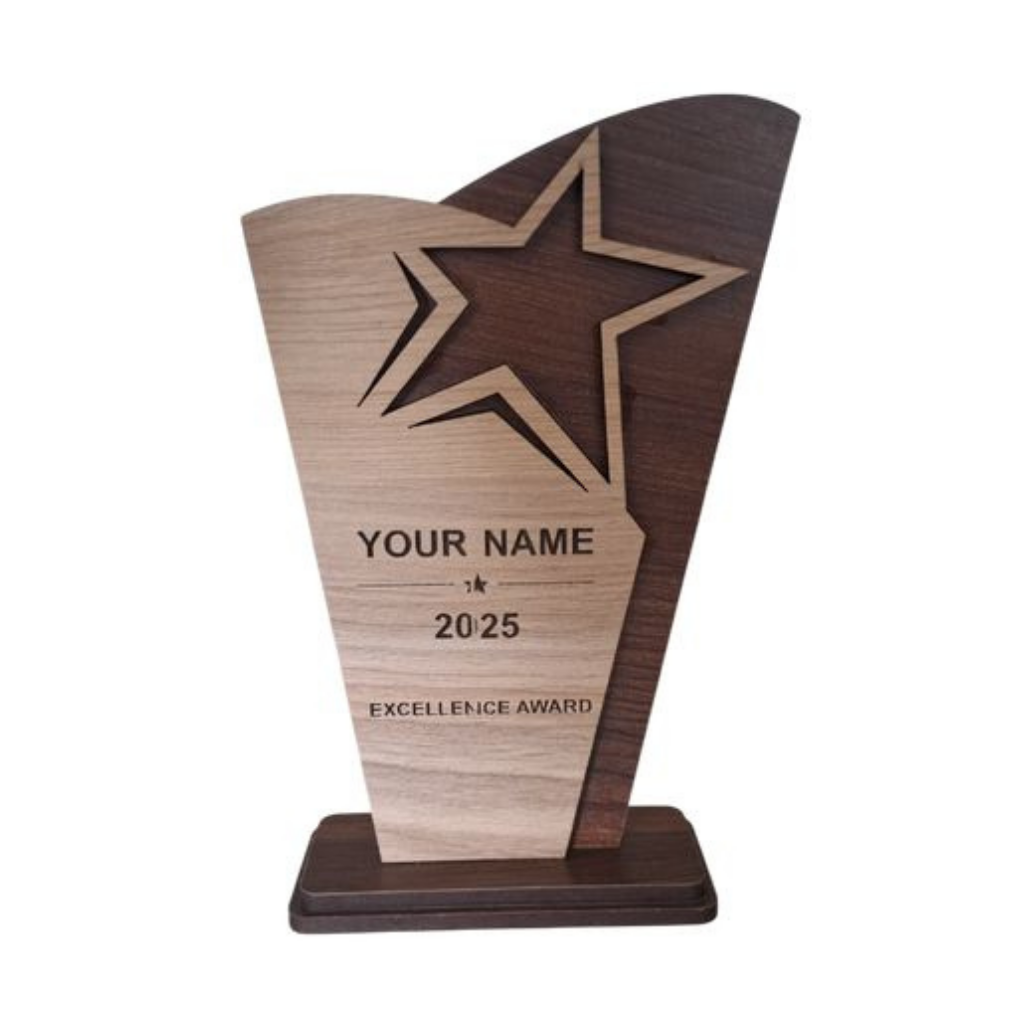 • The award has a two-tone wood finish — a lighter wood on the left side and a darker wood on the right.
