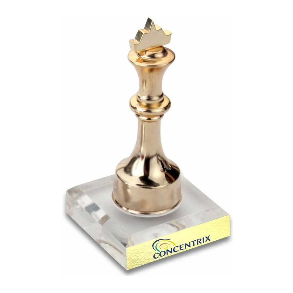 The image shows a trophy or award designed in the shape of a golden chess king piece. The chess piece is sleek, polished, and metallic-looking, symbolizing leadership, strategy, and excellence.