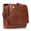 The image shows a brown leather (or leather-look) shoulder bag with a flap-over design. It features a long, adjustable strap with a metal buckle and has a smooth, slightly textured finish. The bag appears structured and compact, suitable for carrying items like a tablet, documents, or daily essentials. It also has subtle stitching details and a small embossed logo near the bottom center of the front flap. The overall style is classic and professional.