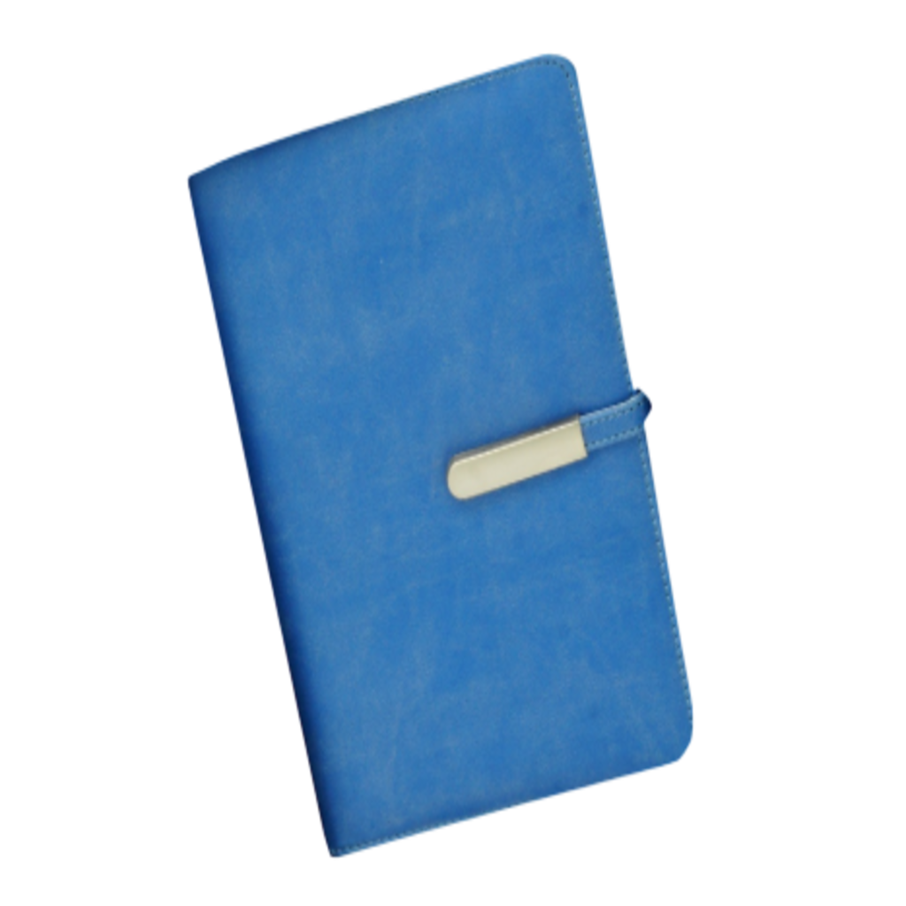 The image shows a blue leather notebook or planner with a sleek and modern design. It has a smooth, matte finish and features a metallic clasp or pen-like closure that keeps it shut. The edges are neatly stitched, adding to its professional appearance. This type of notebook is often used for journaling, planning, or professional note-taking.