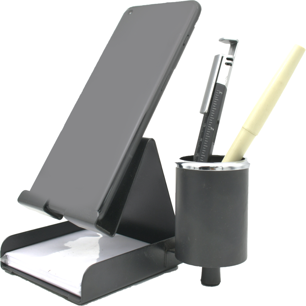 In summary, it’s a compact and practical desk organizer combining a phone stand, pen holder, and note pad tray in one unit.