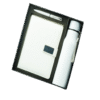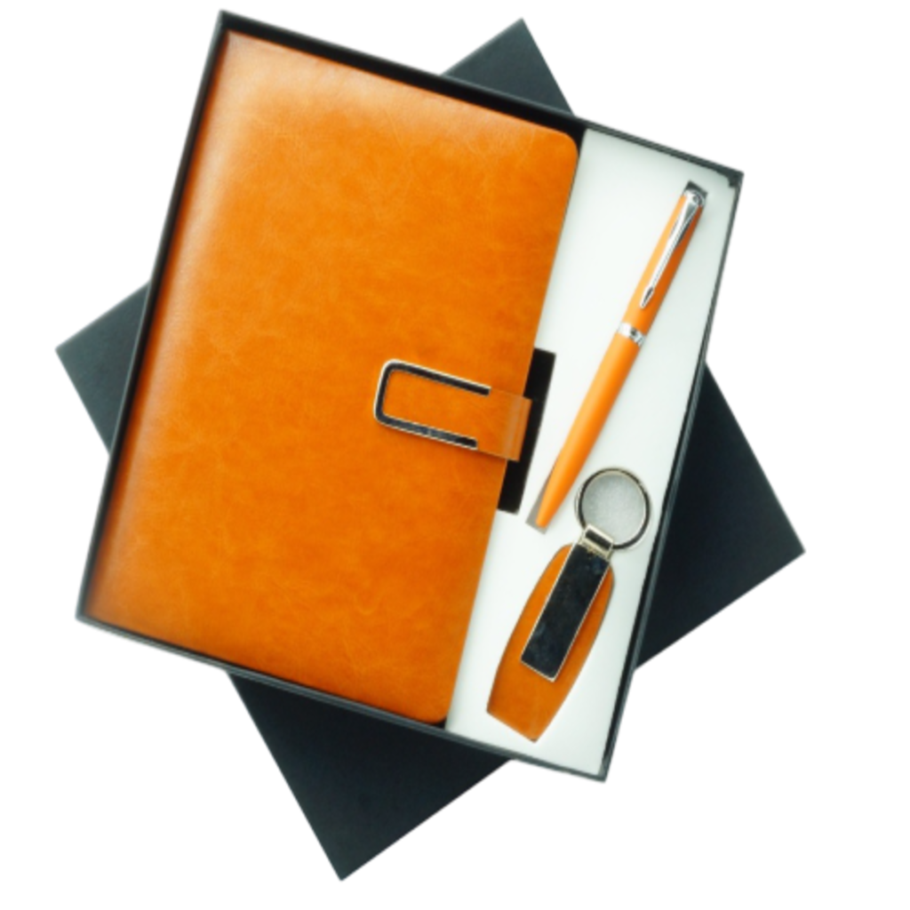 The image displays a neatly arranged gift set inside a black box. The main item is an orange leatherette notebook, featuring a smooth texture with a metallic clasp. Alongside the notebook, there is an orange pen with silver accents, likely designed for writing. Also included are a keychain and a USB flash drive, both in a matching color scheme. The keychain has a sleek, modern design, while the USB flash drive appears stylish with a metallic finish. The overall aesthetic is clean, elegant, and professional, making it a well-suited gift set.