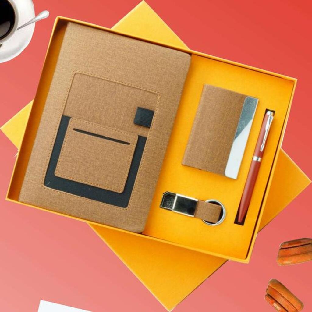 Elevate your professional style with this elegant Executive Gift Set, perfectly designed for corporate gifting and personal use. The set includes a premium notebook, a sleek metal pen, a stylish business card holder, and a durable keychain — all beautifully packed in a vibrant gift box. Ideal for office professionals, business partners, or clients, this combo blends functionality with sophistication.