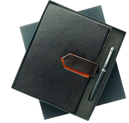 This is an elegant executive gift set featuring a black leather-bound diary with a sleek magnetic or strap closure accented by a brown inner detail. The diary is paired with a premium black pen, both neatly arranged in a black presentation box. The overall look is professional, luxurious, and minimalist, making it ideal for corporate gifting, business executives, or professionals who appreciate refined stationery.