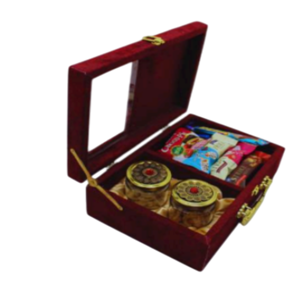 The image shows an elegant wooden gift box with a hinged lid and a golden latch. Inside, the box is divided into compartments — one side contains two decorative glass jars with ornate lids, likely filled with dry fruits or sweets, while the other side holds a selection of assorted snacks or treats in colorful wrappers. The interior is lined with satin fabric, adding a luxurious touch. The overall presentation suggests it’s a premium gift hamper, suitable for festive occasions or special events.