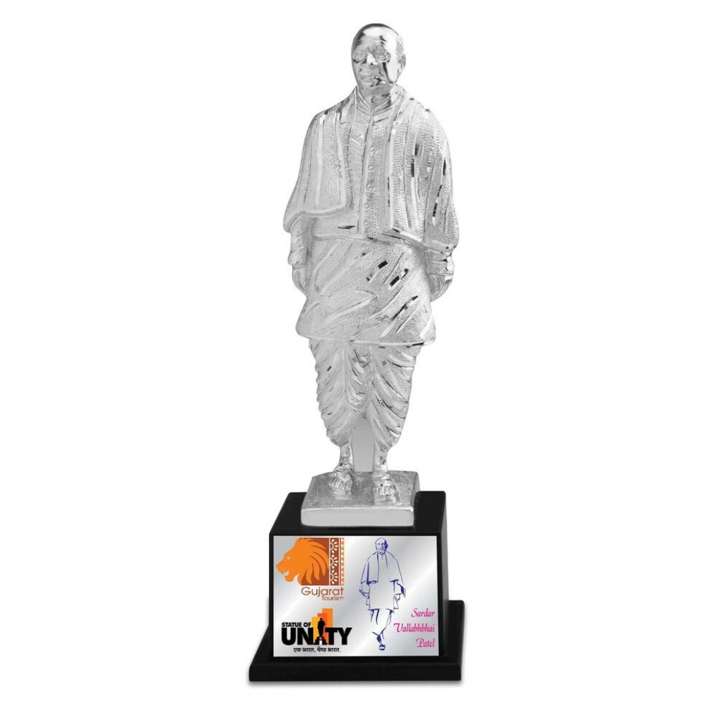 The image shows a silver-colored miniature statue of Sardar Vallabhbhai Patel, a key leader in India’s independence movement and the country’s first Deputy Prime Minister and Home Minister.