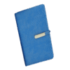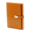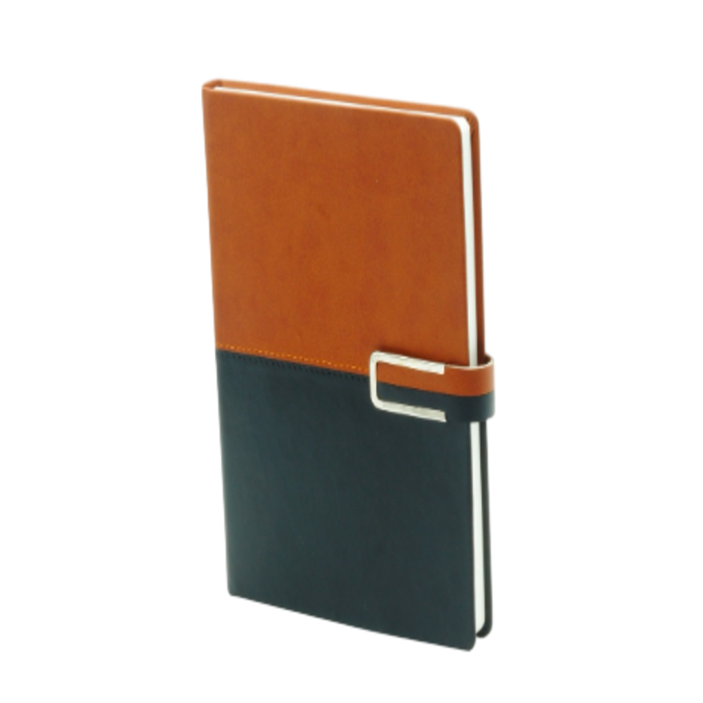 The image shows a stylish notebook or journal with a two-tone leather or leather-like cover. The upper part of the cover is a warm, tan brown color, while the lower part is a deep black. It features a sleek metallic clasp or buckle that secures the notebook closed, giving it a modern, professional appearance. The pages inside appear to be white or lightly lined, and the overall design suggests it’s suitable for business or personal use.