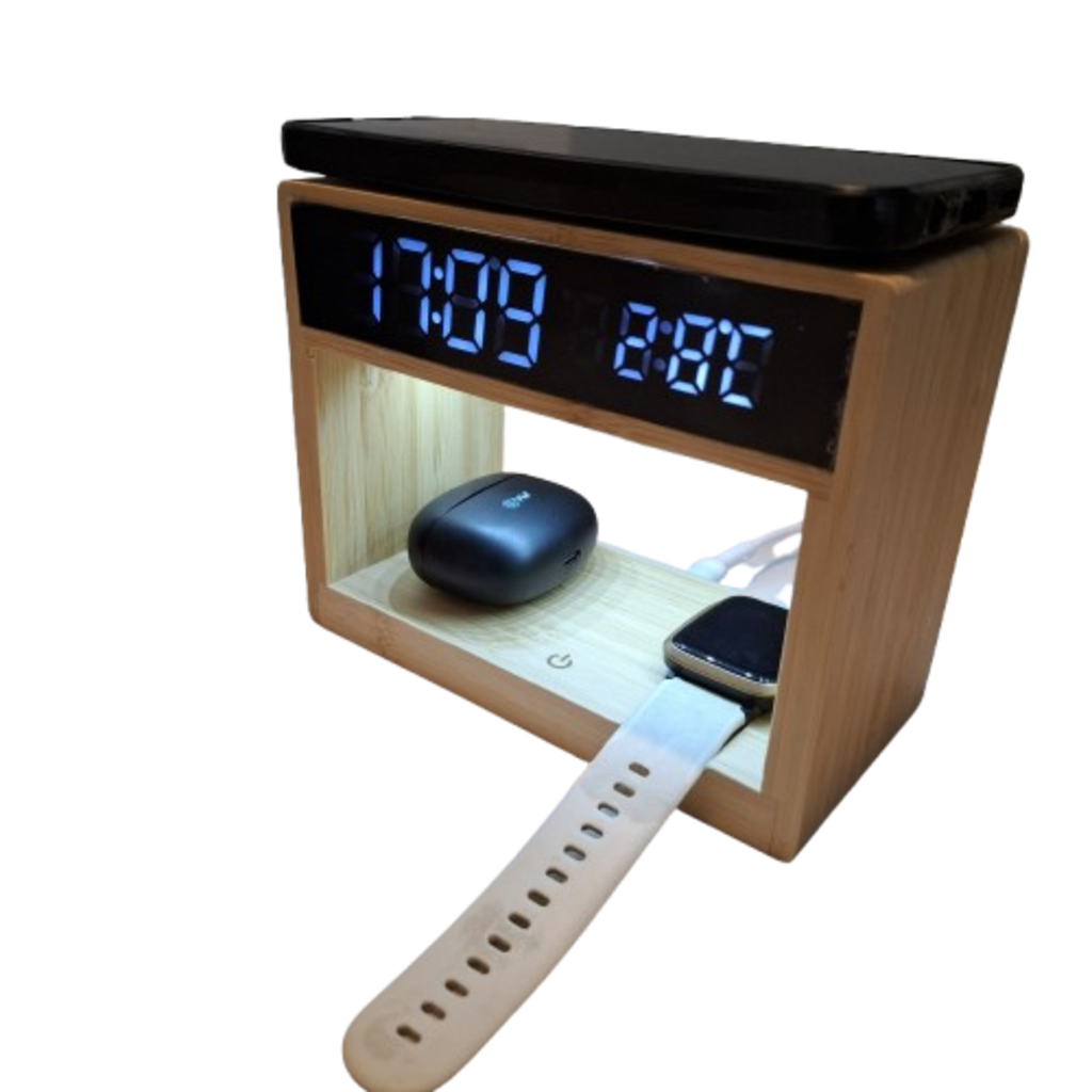 This device serves as a digital clock, temperature display, and a 3-in-1 wireless charging station, ideal for use on a bedside table or office desk.